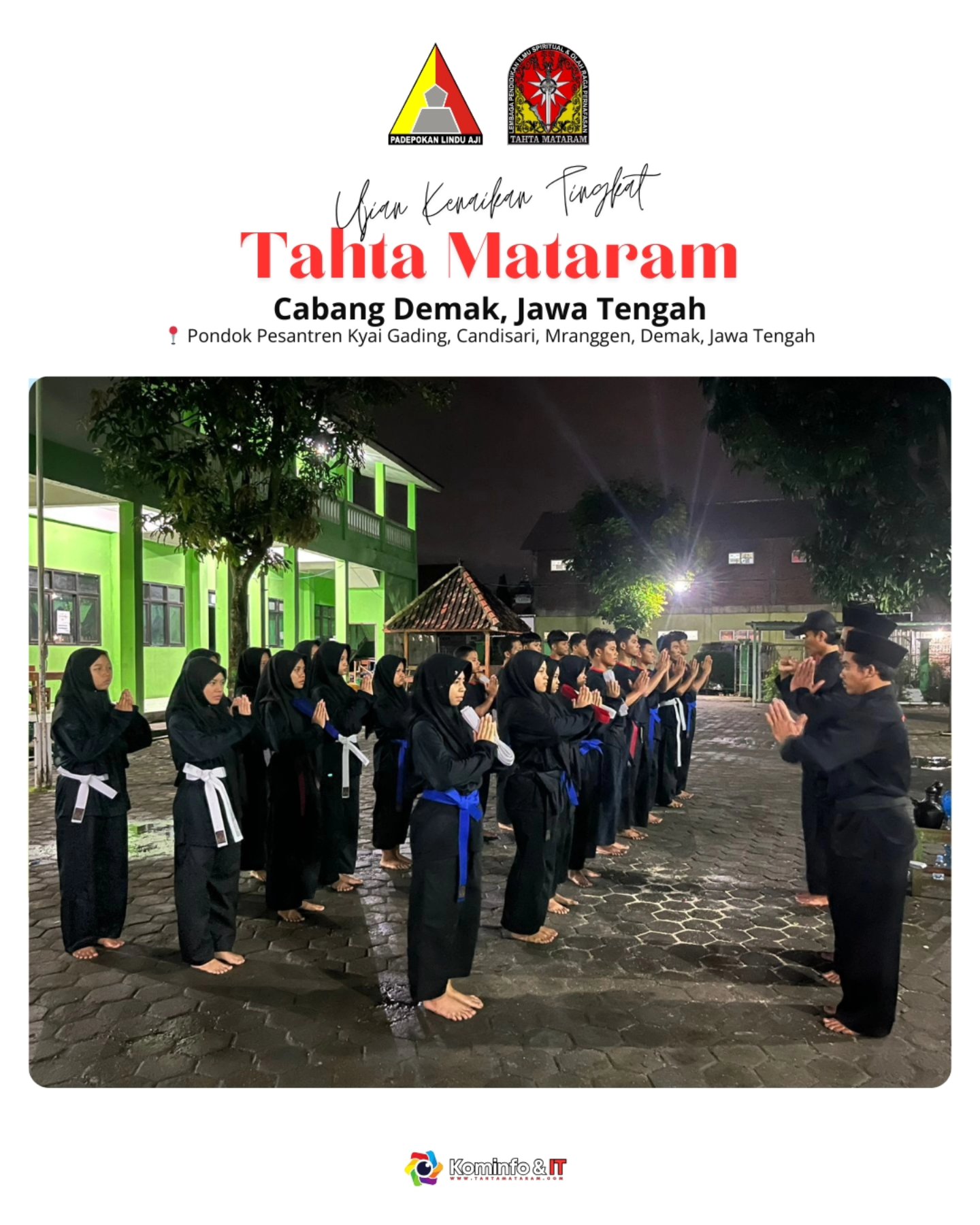 Demak — Tahta Mataram Cabang Demak kembali melaksanakan salah satu tradisi penting dalam proses pembinaan anggotanya, yakni Ujian Kenaikan Tingkat, yang diselenggarakan pada Sabtu, 10 Januari 2026, bertempat di Pondok Pesantren Kyai Gading, Mranggen, Kabupaten Demak. Kegiatan ini berlangsung dengan suasana tertib, khidmat, dan penuh semangat kebersamaan.